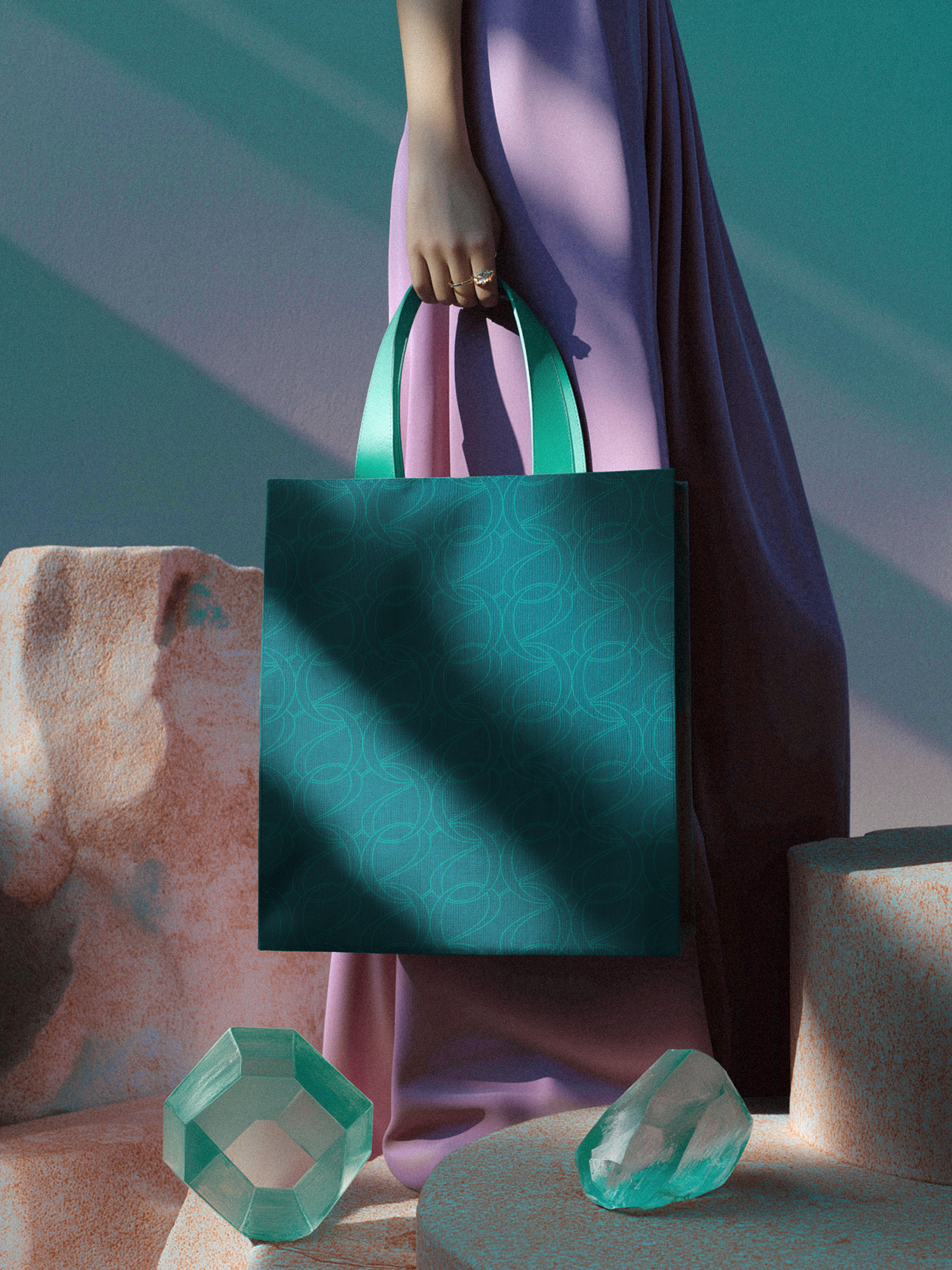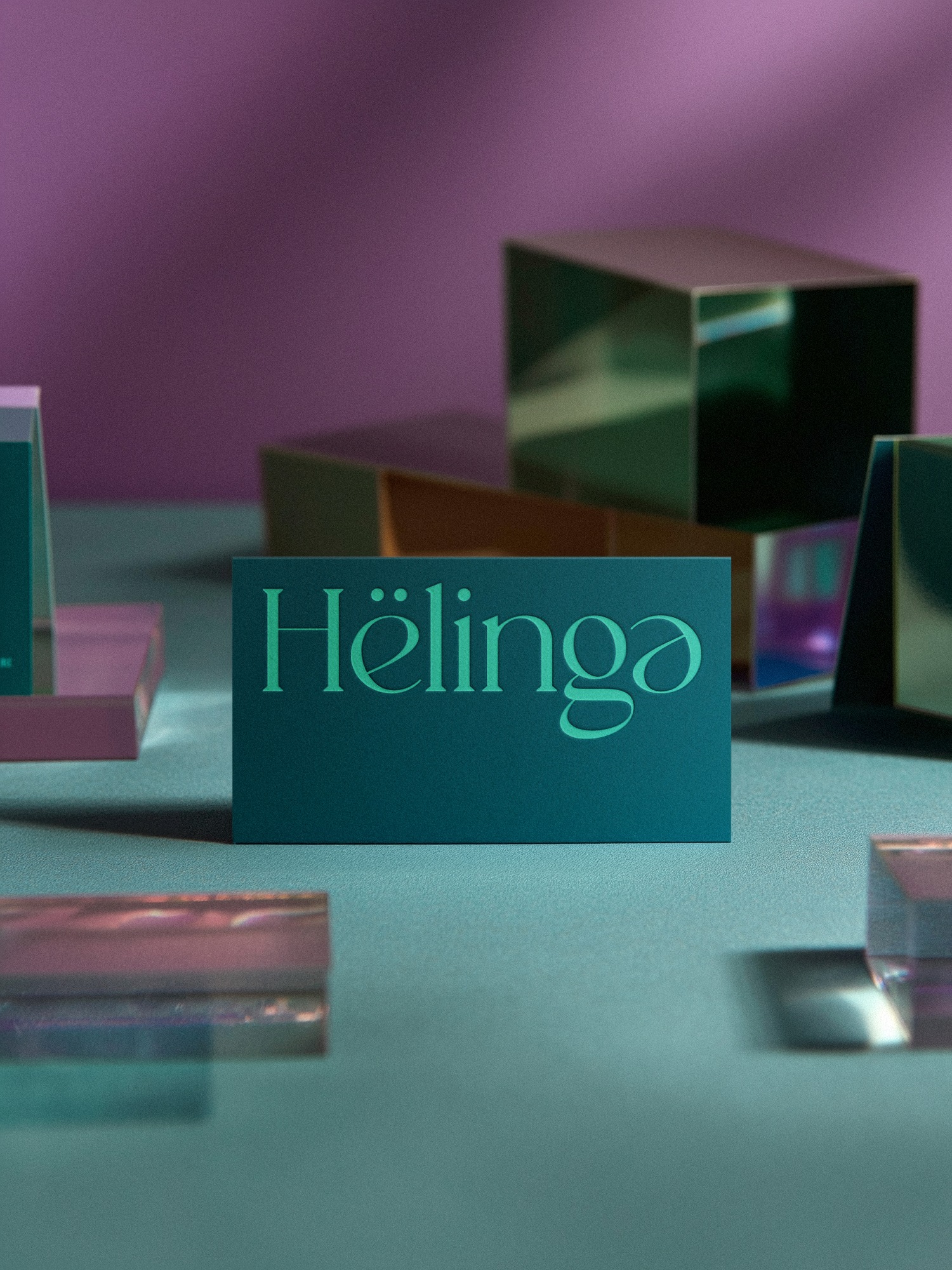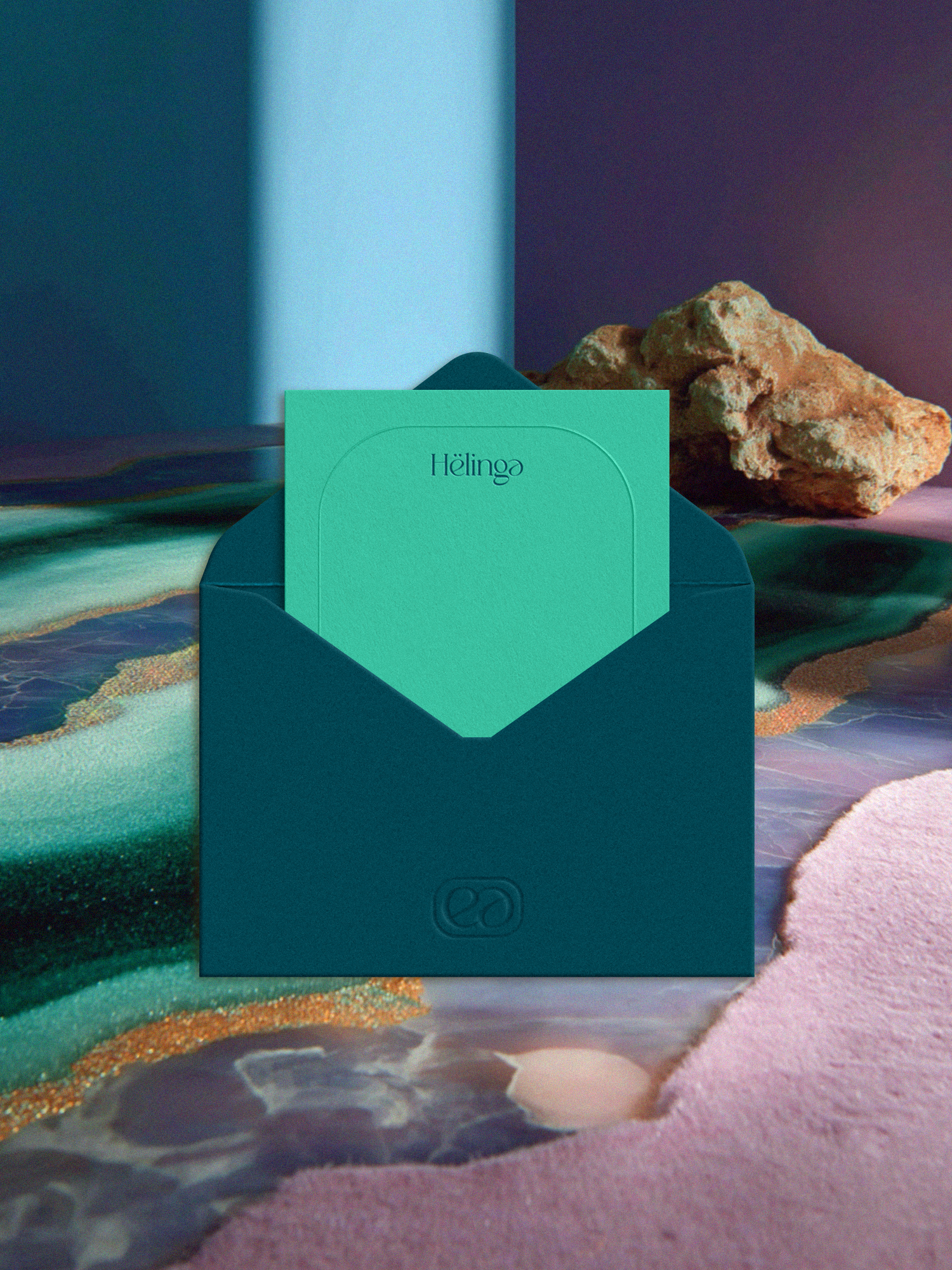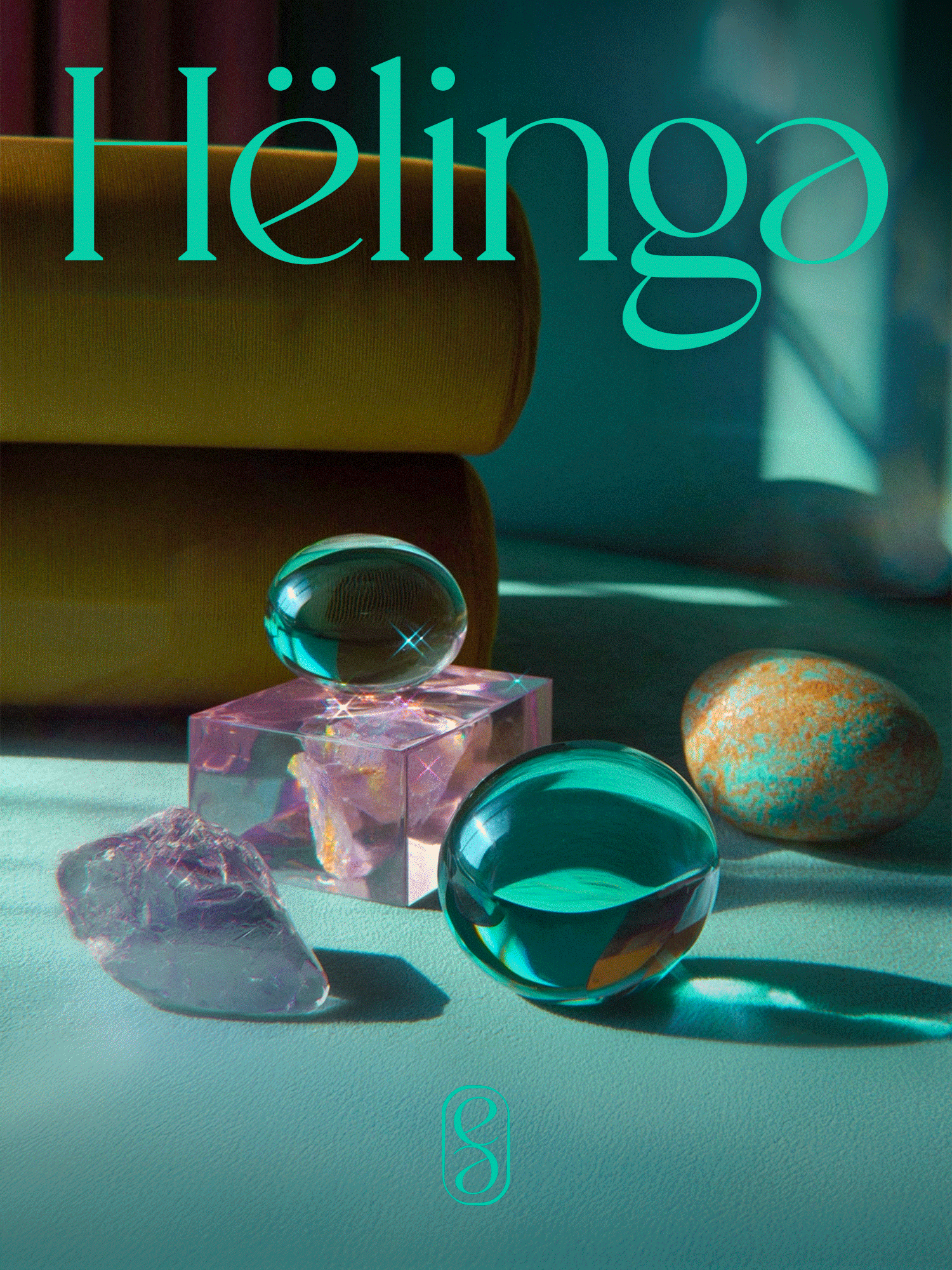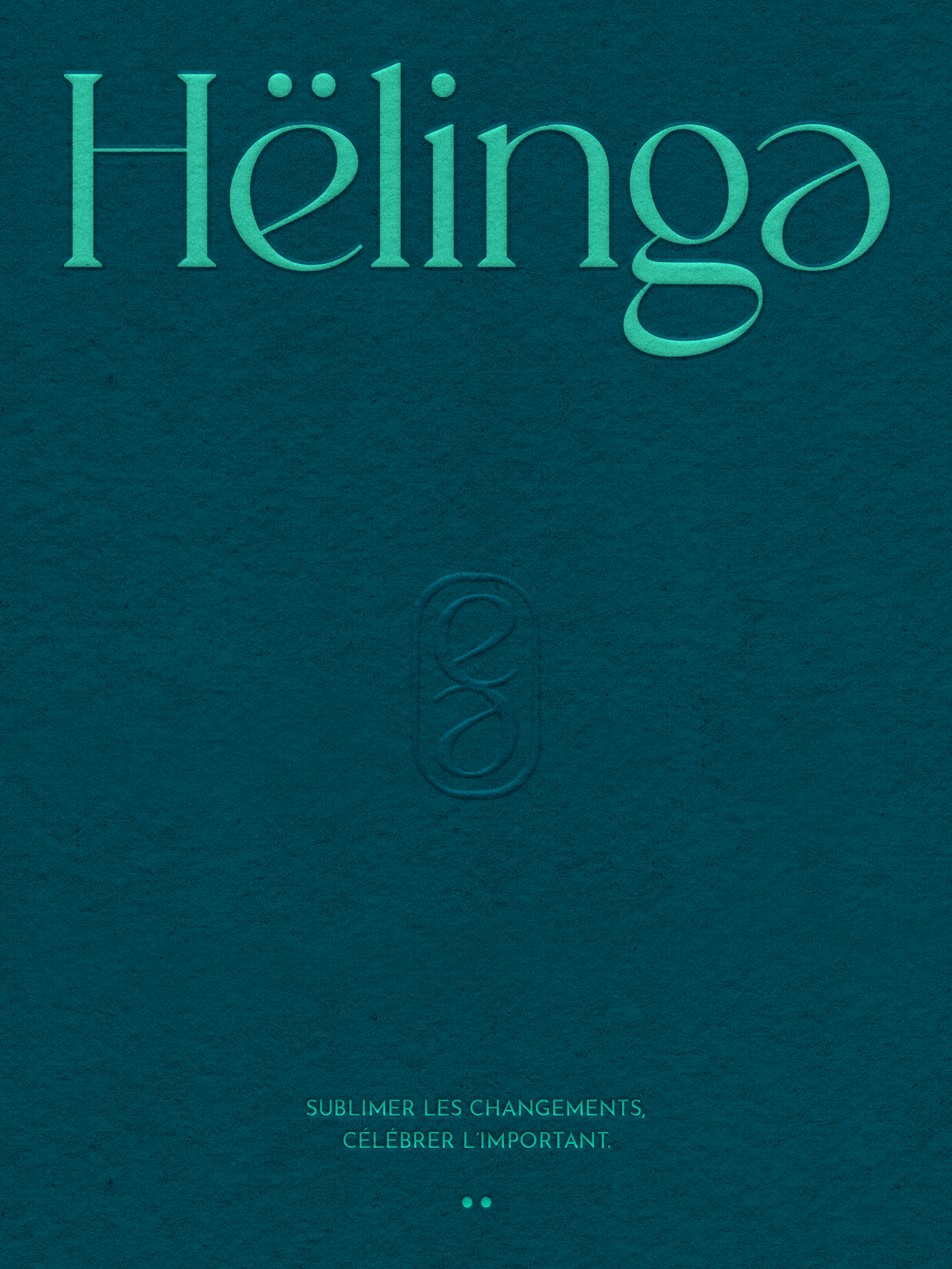 Le logo, avec un A redessiné, symbolise l’entrelacement et la versatilité des créations. Des variantes multi-support, un symbole graphique et un motif Art déco assurent cohérence et singularité sur tous les supports, de l’écrin à l’emballage et au merchandising. La palette s’articule autour du bleu pétrole et du vert menthe, traduisant élégance et modernité, complétés par le lila et le beige, subtils et raffinés. Cet équilibre affirme Hëlinga comme une marque solaire, joyeuse et contemporaine.