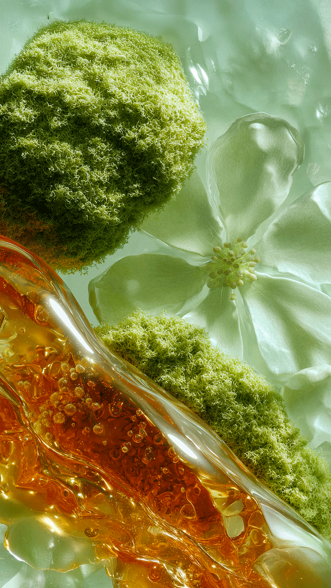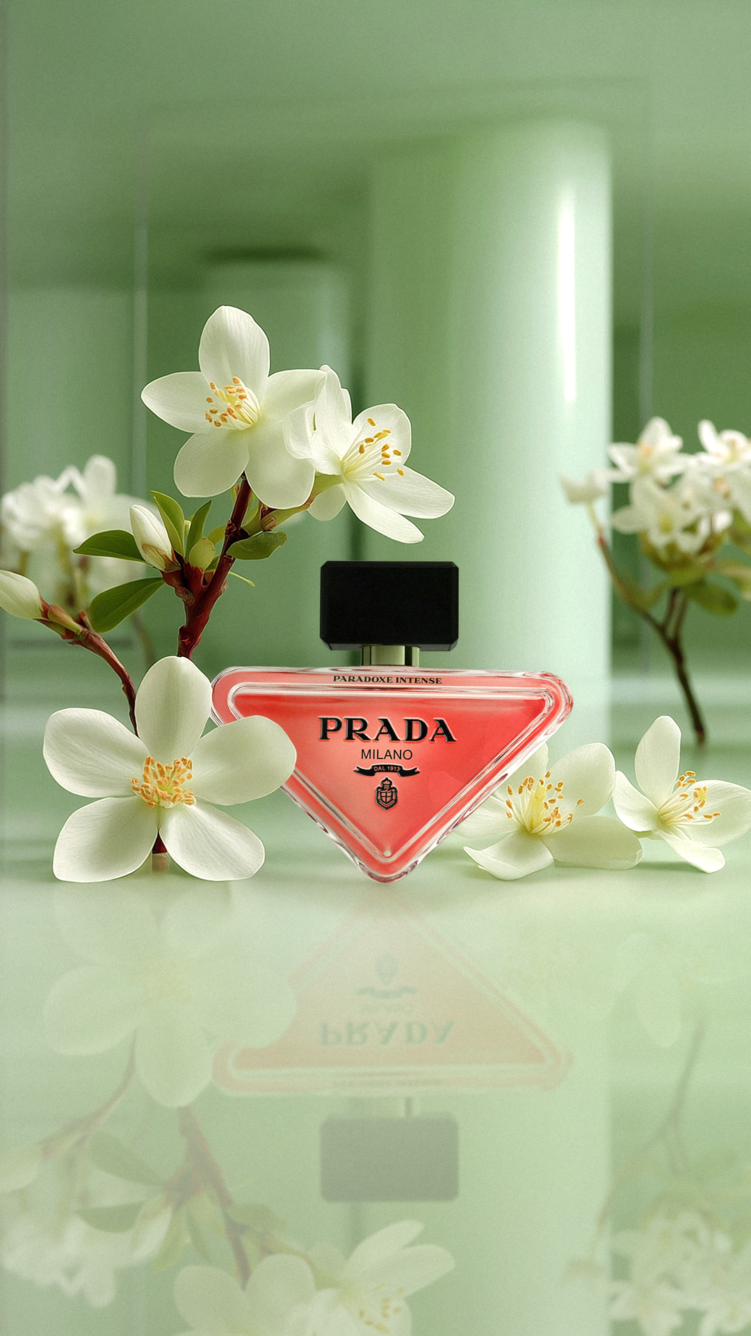 J’ai opté pour le parfum Prada afin d’interpréter visuellement son accord unique de mousse, jasmin et ambre. Ces ingrédients — entre minéral, végétal et floral — ont inspiré des images jouant sur les contrastes : matières brutes, douceur tactile, fraîcheur et intensité.